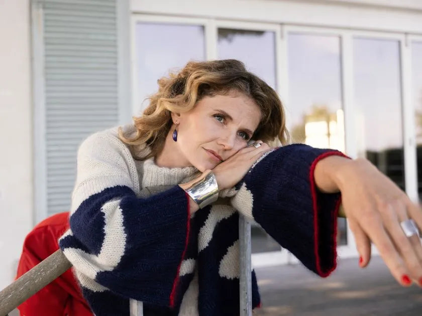 The inspiration for this oversized sweater comes from Japanese woodcuts, reflected in the flowing, contrasting fields of colour – like a sea in motion: shimmering, foaming and dancing – hence the name Umi, the Japanese word for sea. The shape of the sweater is inspired by traditional Japanese design, with a simple and spacious cut. Like a warm embrace, it can be worn on cool summer days – perhaps for a trip out on the sea, or simply out into the blue.