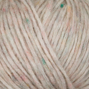 The manual sorting process is extensive, and both we and our mill take great pride in offering a truly sustainable yarn. This allows knitters to enjoy high-quality yarns without contributing to the environmental impact of new production or dyeing processes. The yarn carries subtle traces of different shades from the recycled fibres, creating a unique, tweedy, and harmonious look with natural colour variation.